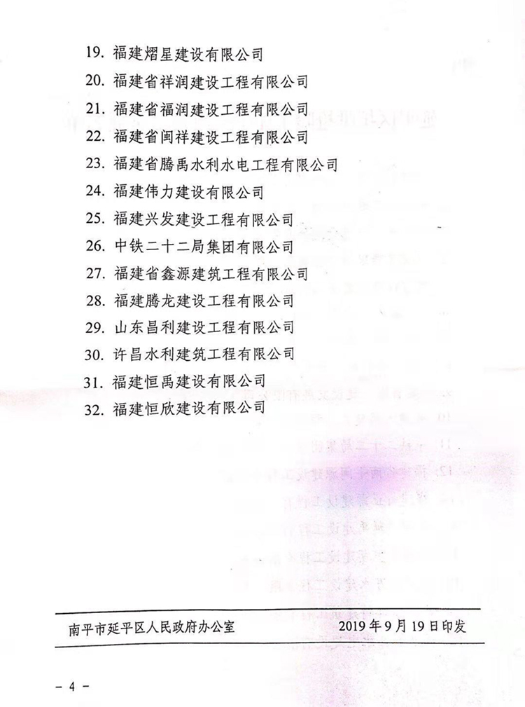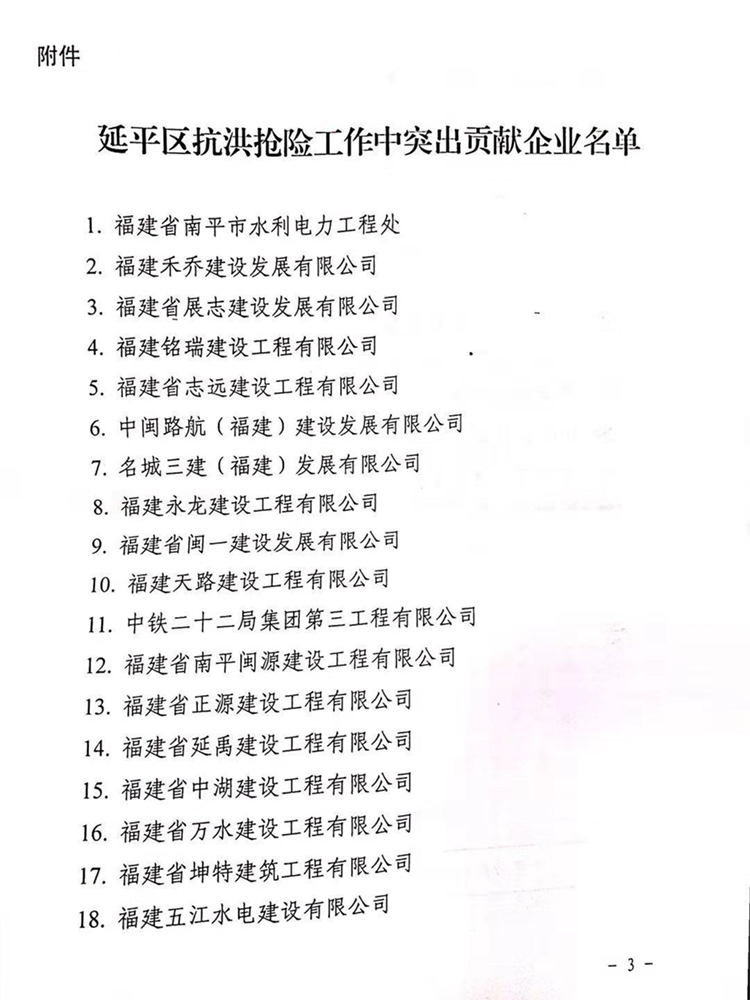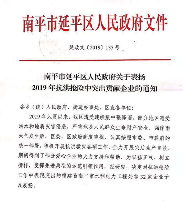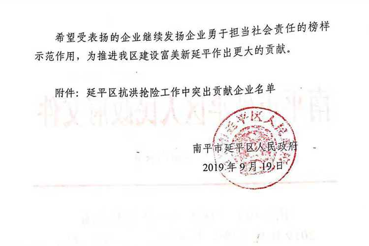 南平市延平区人民政府关于表扬2019年抗洪抢险中突出贡献企业的通知